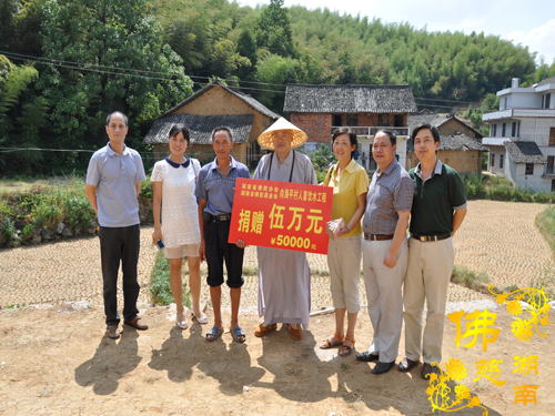 我们到达邵东县双凤乡海坪村,得知这里是最贫困又遇上干旱的村庄。全村7个组,120户498人,有水田136亩,旱土195亩。去年这里的农民年收入仅2000元,人和畜饮水困难,作物颗粒无收。在现场圣辉大和尚代表湖南省佛慈基金会捐助抗旱灾善款5万元,用于修建引水工程。