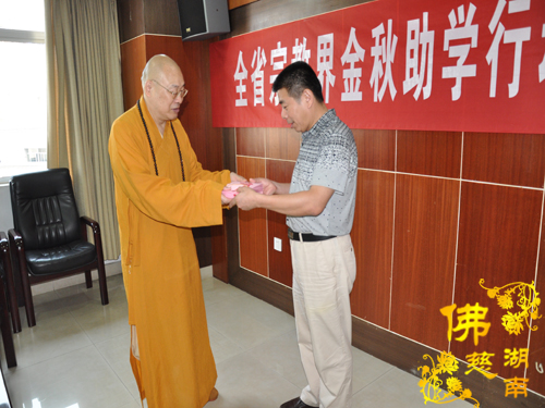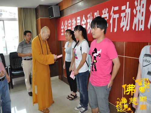 在捐助仪式上,湘潭市委统战部纪检组长龙香玖讲了话,湘潭市受资助的学生代表刘尔倩表示感谢发了言。圣辉大和尚作了重要讲话:鼓励准备入校的大学生,努力学好文化知识,将来报效祖国,回报社会。圣辉大和尚代表省佛慈给予25名准备入校的贫困大学生每人2000元,共捐助善款5万元。同时圣辉大和尚本人给予其中在外地上学的7名贫困大学生每人3000元,共资助2.1万元。