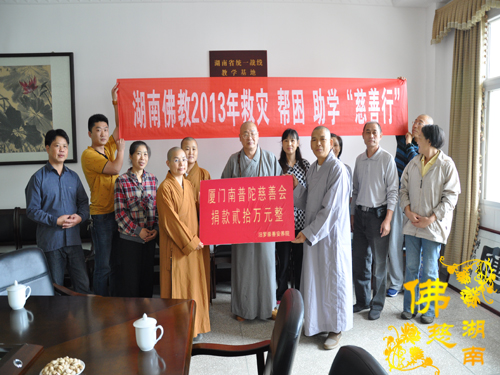 捐赠仪式上,南普陀寺慈善会向汨罗市崇善安养院捐善款20万元。这已是连续六年资助汨罗市崇善安养院的孤寡老人。圣辉大和尚看望了现在还居住着的40多位孤寡老人,还有几位残疾孤儿,还当场替一名孤寡老人刮胡子,并嘱咐崇善安养院以“颐养天年,快乐人生”为宗旨,秉承以“爱心、热心、细心、关心”服务为理念,替天下儿女尽孝,要把为老人服务视为最大的快乐、最大的心愿。