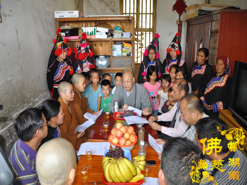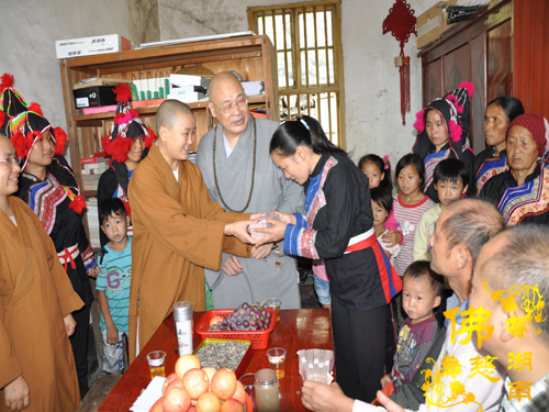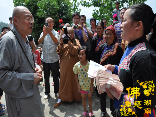 宜章县瑶族村民族团结小学的捐赠仪式,挤在小学的一间小小的房间里举行。圣辉大和尚亲切的抚摸着小学生的头,鼓励小学生们一定要好好学习,有很多好心人在关注着他们,会帮他们度过难关。圣辉大和尚还亲自捐出2000元钱,嘱咐校长给小学生买学习用品。紧接着南普陀寺慈善会捐善款5万元,湖南省佛慈基金会捐善款5万元,用于修建团结小学饮水工程和新建学校学生食堂所缺资金。