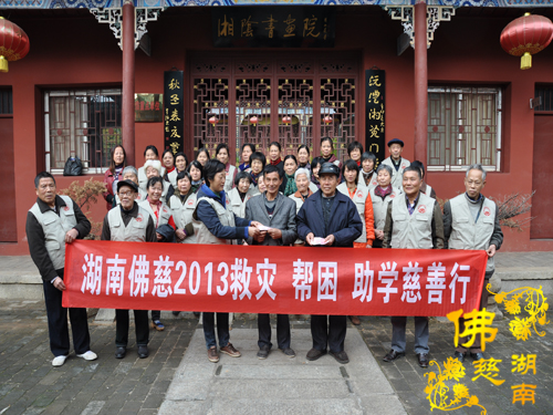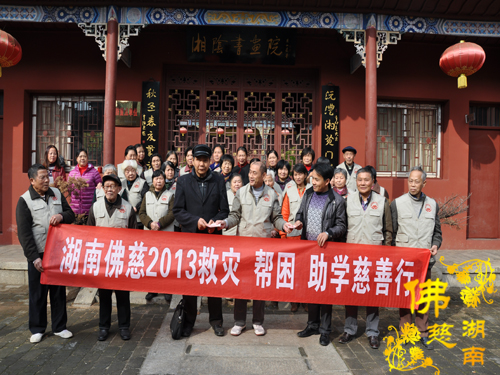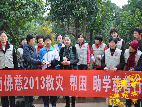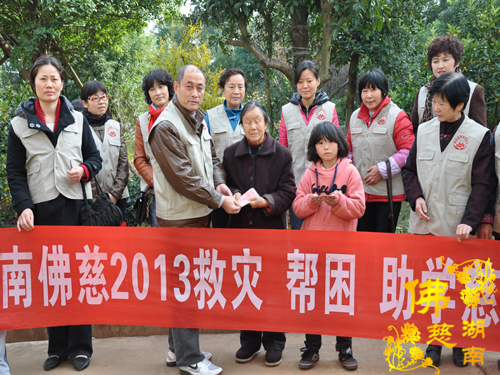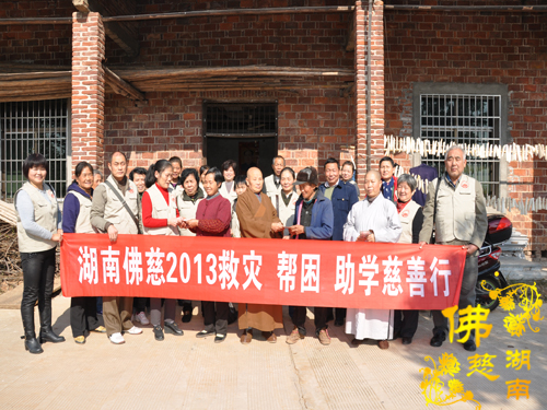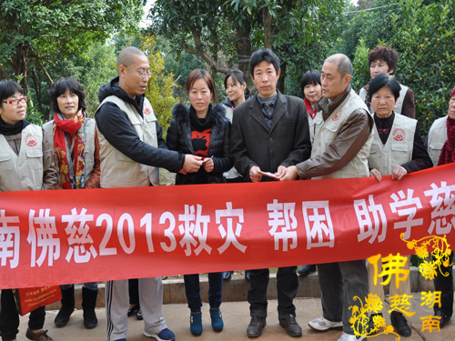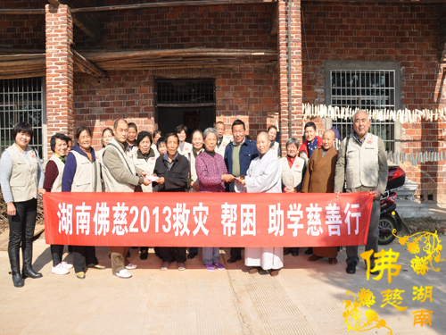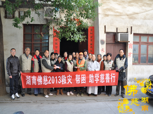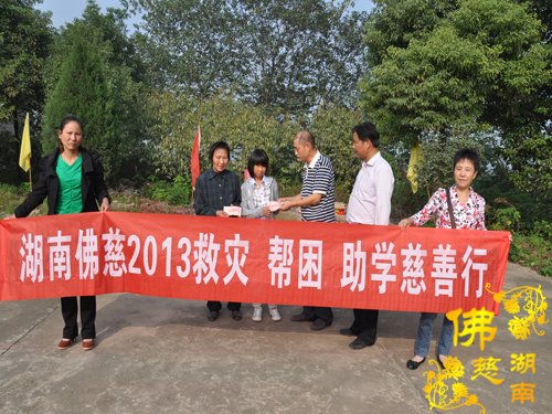 2013年11月26日上午,湖南省佛慈基金会周仲山秘书长以及湖南省佛慈基金会几位工作人员受会长圣辉大和尚的嘱托,首先前往汨罗市资助翁叶庭、潘德荣、黎磊、钟 浴、赵寒薇、张 韦,共6户贫困家庭,每户各1000元。随后省佛慈工作人员又赶往湘阴县资助姚孟光、李国煌、钱贵英、胡仁辉,湘阴县新泉镇刘景林、刘吉林,共6户贫困家庭,每户各1000元。