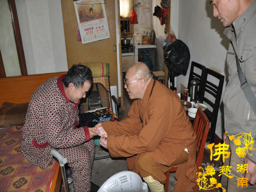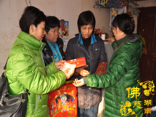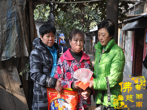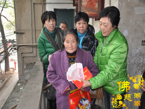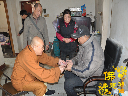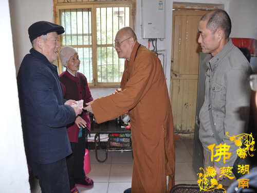 2014年1月19日下午在年终将至之时,中国佛教协会副会长、湖南省佛教协会会长、湖南省佛慈基金会会长圣辉大和尚,带领湖南省佛慈基金会周仲山秘书长以及湖南省佛慈基金会工作人员及众会员组长们,为了配合长沙市“邻里守望,崇德向善迎新春、红红火火过大年”学雷锋红十字博爱送万家的活动,将几十份爱心善款,亲自送到每户特困人员的家中。