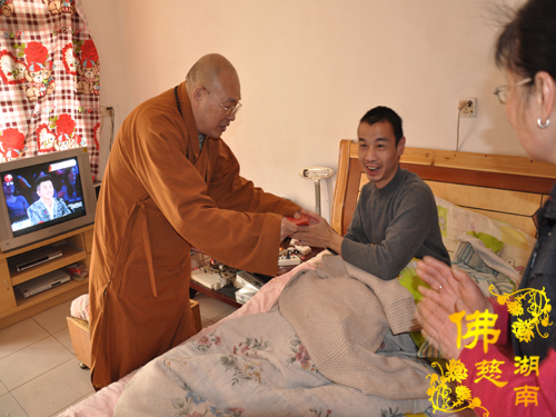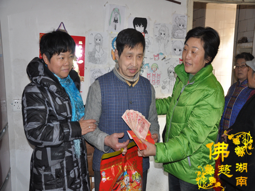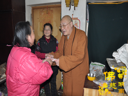 圣辉大和尚一行人员,首先再次来到长沙市化工机械厂,看望资助居住在这里的8户特困家庭,给他们每户送去了善款1000元及大礼包一份。圣辉大和尚来到特困户余杏元家中时,看见余奶奶的残疾儿子睡在床上,当即拿出别人供养他的红包送给了余奶奶的儿子。湖南省佛慈基金会在以后的几天里,还会陆续将剩余的几十户善款及时送到特困家庭手中,让他们每户都感受到来自党和政府以及社会爱心人士的关怀,都能过一个祥和温馨的春节。