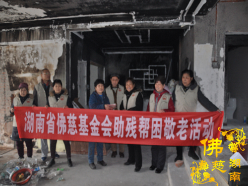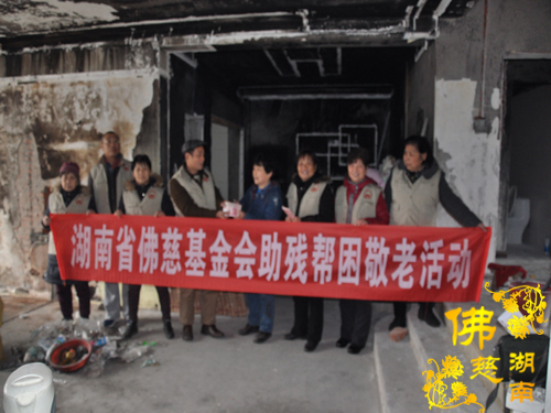 2014年3月2日上午,湖南省佛慈基金会周仲山秘书长受湖南省佛慈基金会会长圣辉大和尚的嘱托,联合湘潭海会寺前往湘潭市岳塘区霞光中路霞光山庄小区19栋301室,慰问资助遭受严重火灾致使整个房屋烧得面目全非的省佛慈会员楚福秋家,及时送去善款3.7万元。