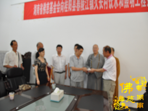 2014年6月20日上午,中国佛教协会副会长、湖南省佛教协会会长、湖南省佛慈基金会会长圣辉大和尚以及湖南省佛慈基金会周仲山秘书长带领省佛慈基金会工作人员一行,第四站到达桂阳县。圣辉大和尚代表省佛慈基金会向桂阳县舂陵江镇久长村饮水工程捐善款5万元。