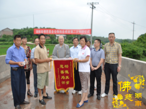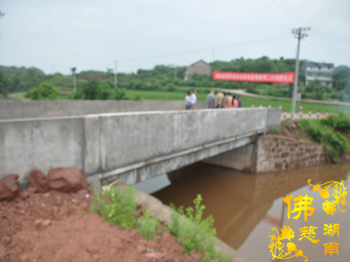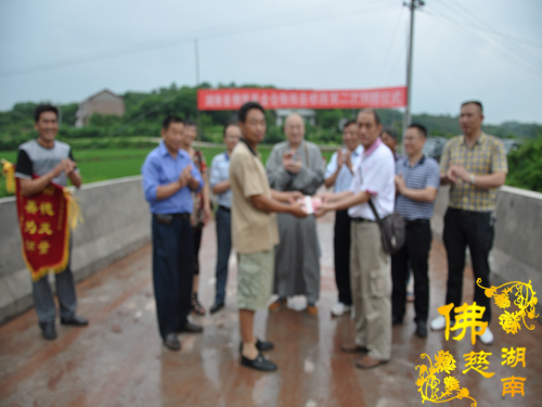 2014年6月20日下午,中国佛教协会副会长、湖南省佛教协会会长、湖南省佛慈基金会会长圣辉大和尚以及湖南省佛慈基金会周仲山秘书长带领省佛慈基金会工作人员一行,冒着倾盆大雨行驰在高速路上,第五站到达衡南县潭子山镇炮公村。湖南省佛慈基金会会长圣辉大和尚代表省佛慈基金会再次向衡南县潭子山镇炮公村捐善款5万元,用于当地修桥、修路所欠缺用款。去年已捐助6万元,今年再追加5万元,帮助潭子山镇炮公村完成修桥、修路工程用款。