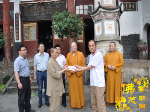 2014年6月25日下午,中国佛教协会副会长、湖南省佛教协会会长、湖南省佛慈基金会会长圣辉大和尚以及湖南省佛慈基金会周仲山秘书长带领省佛慈基金会工作人员一行,马不停蹄奔赴第十站到达新邵县白云岩毘盧寺,在现场资助新邵县白云岩毘盧寺5万元善款,用于改造维修破损裂缝的旧房屋。