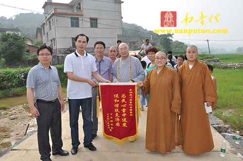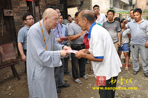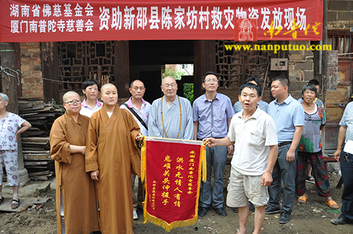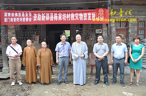 2014年6月30日下午,全国人大代表、中国佛教协会副会长、湖南省佛教协会会长、湖南省佛慈基金会会长、厦门市南普陀寺慈善会会长圣辉大和尚带领南普陀寺慈善会道晴法师、果瑞法师、静仁法师以及湖南省佛慈基金会周仲山秘书长、曹主任等一行,从娄底市新化县赈灾后,紧接着又来到湖南省邵阳市新邵县慰问受灾群众。南普陀寺慈善会为新邵县寸石镇马栏村、陈家坊镇陈家坊村110户灾民,每户发放了300元慰问金及价值120元的米和油,共捐善款4.62万元,希望灾区人民早日摆脱困境,重建美好家园。另在救灾过程中,圣辉大和尚本人资助新邵县孤儿毕珊嫣5000元善款。