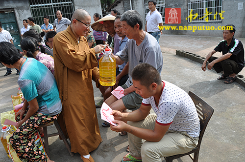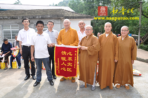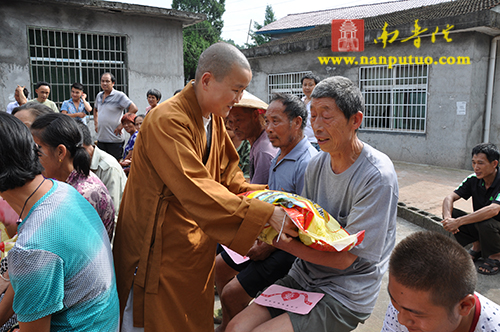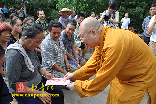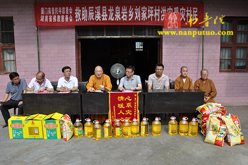 2014年7月1日下午,全国人大代表、中国佛教协会副会长、湖南省佛教协会会长、湖南省佛慈基金会会长、厦门市南普陀寺慈善会会长圣辉大和尚带领南普陀寺慈善会道晴法师、果瑞法师、静仁法师以及湖南省佛慈基金会周仲山秘书长、曹主任等一行,来到湖南省怀化市辰溪县慰问受灾群众。南普陀寺慈善会为辰溪县龙泉岩乡刘家坪村100户重灾户,每户发放了300元慰问金及价值120元的米和油,共捐善款4.2万元,希望受灾群众化悲痛为力量,早日重建家园。