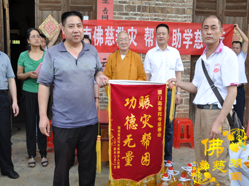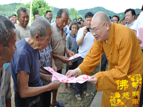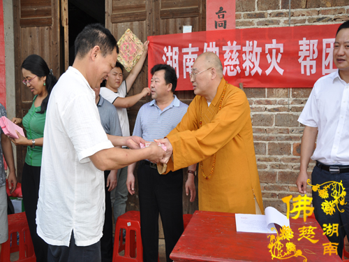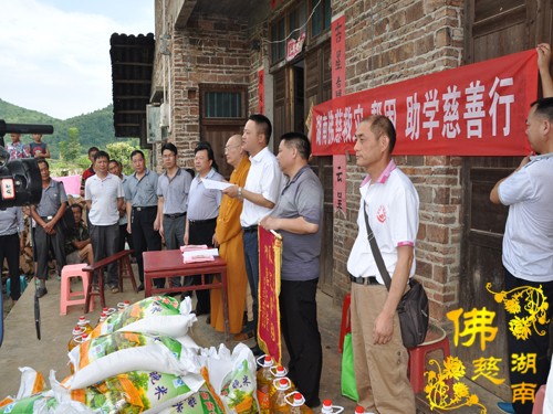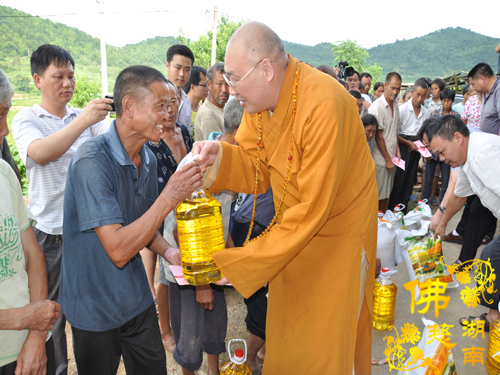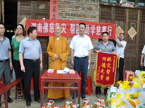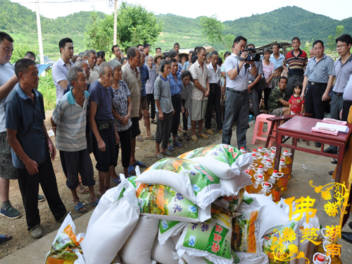 2014年7月2日上午,全国人大代表、中国佛教协会副会长、湖南省佛教协会会长、湖南省佛慈基金会会长圣辉大和尚带领湖南省佛慈基金会周仲山秘书长以及省佛慈基金会工作人员一行,奔赴至第十六站,到达武冈市。在受灾现场,湖南省佛慈基金会资助武冈市双牌乡浩山云雾村以及邓家铺新建村遭受水灾的100户村民,每户300元,油和米每户120元,共捐善款4.2万元。