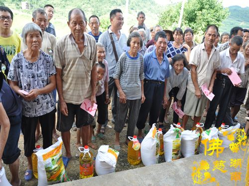自五月以来,武冈市各地持续普降大暴雨。武冈市双牌乡浩山云雾村因冬云水库发生管涌,造成大面积农作物受损,颗粒无收,部分村民的房屋倒塌。武冈市邓家铺新建村因大暴雨造成大水灾,村民的农作物受损,房屋倒塌严重。武冈市的两个乡灾情严重,特向湖南省佛慈基金会求助,会长圣辉大和尚得知灾情后,带领省佛慈第一时间给予了资助。