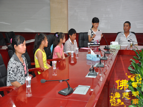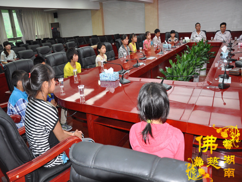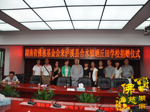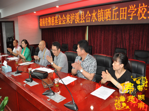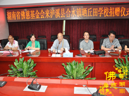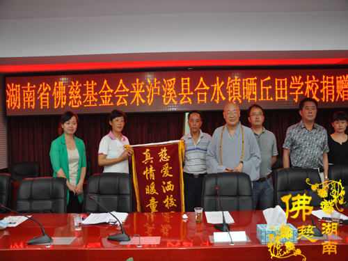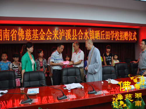 2014年7月3日下午,全国人大代表、中国佛教协会副会长、湖南省佛教协会会长、湖南省佛慈基金会会长圣辉大和尚带领湖南省佛慈基金会周仲山秘书长以及省佛慈基金会工作人员一行,赶赴至第十八站,到达湘西泸溪县合水镇。捐助仪式在县政府会议室内举行,湖南省佛慈基金会资助湘西泸溪县合水镇晒丘田完全小学的52名贫困留守儿童,给予每位学生500元助学款,共捐善款2.6万元。湖南省佛慈尽微力帮助合水镇晒丘田完全小学这些贫困留守儿童,减少一点他们在生活上以及交学费时的负担。让他们能够感受到在爱的阳光下健康快乐的成长。