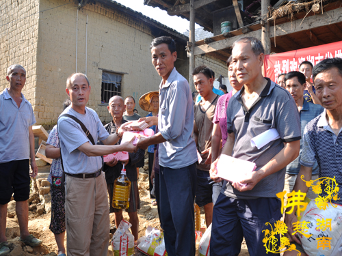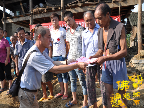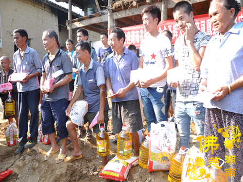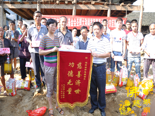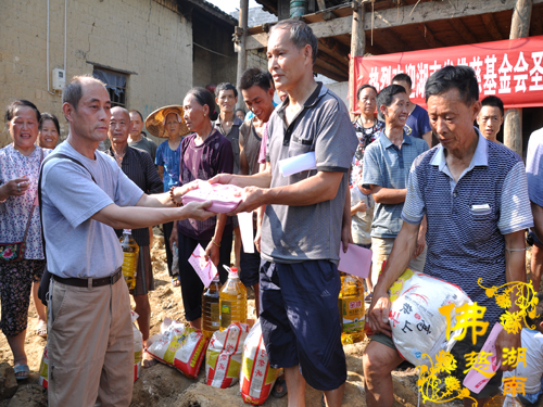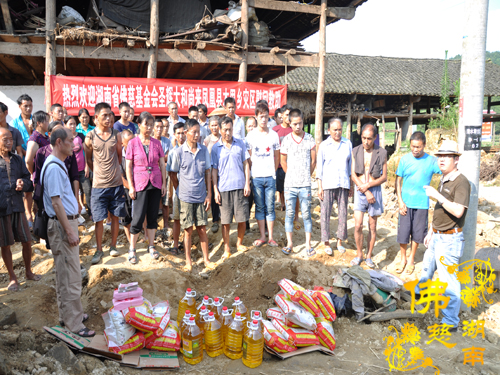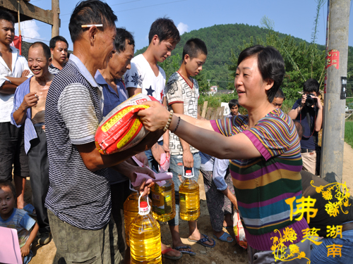 捐赠仪式在凤凰县木里乡两个村的受灾现场举行,湖南省佛慈基金会向湘西凤凰县木里乡受洪灾的柳甄村100户村民和柳甲村100户村民,每户给予300元现金以及大米食用油120元的资助,共捐善款8.4万元。希望受灾村民恢复生产自救,早日渡过目前的难关。