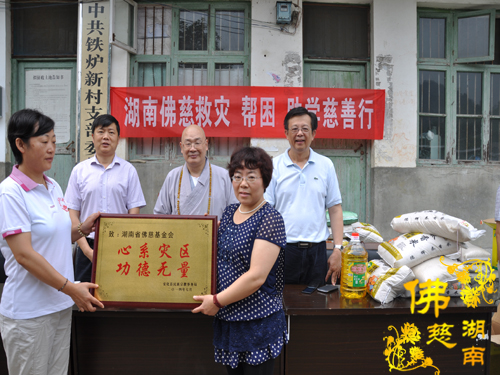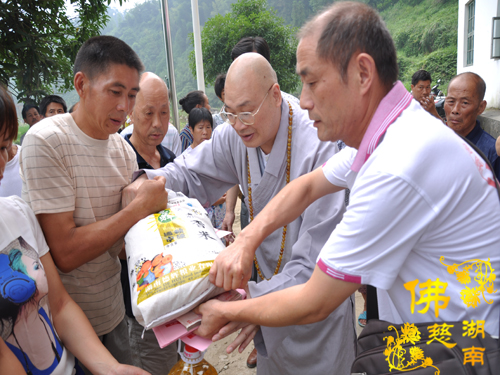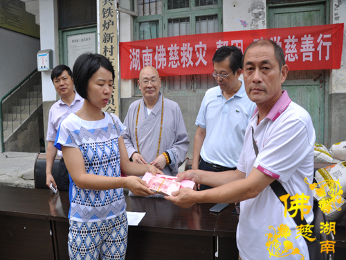 湖南省佛慈基金会会长圣辉大和尚得知安化县7.15特大暴雨洪灾,以致县、乡、镇出现多处山体滑坡,房屋倒塌,造成8人因灾死亡的情况后,立即带领省佛慈基金会工作人员赶赴安化县,在受灾现场给予安化县南区30户受灾群众、东坪镇铁炉新村、中砥村30户受灾村民、马路镇潺溪口村、澄坪村40户受灾村民,共100户,每户给予300元现金和大米食用油120元的资助,共捐善款4.2万元。