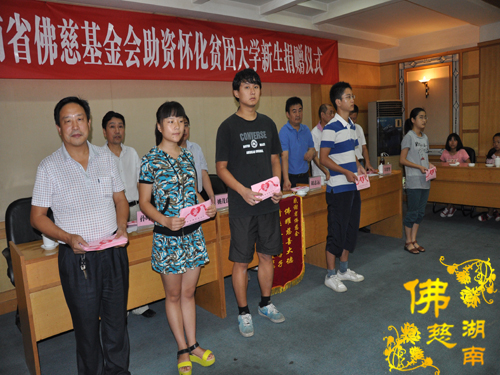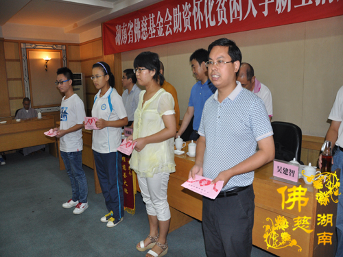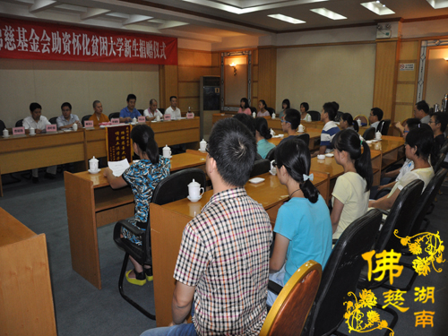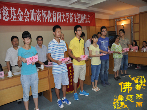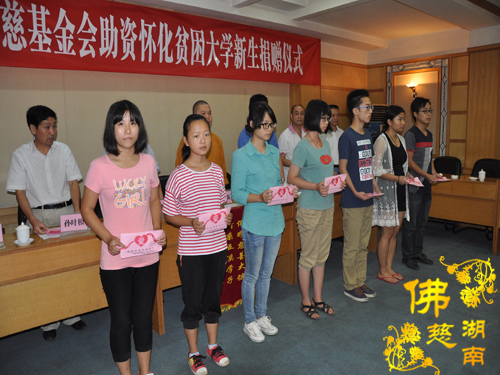 2014年8月26日上午,湖南省佛教协会办公室副主任通振法师、省佛慈基金会秘书长周仲山、省佛慈办公室主任曹银艳,受中国佛教协会副会长、湖南省佛教协会会长、省佛慈基金会会长圣辉大和尚的委托,前往怀化地区资助28名贫困大学新生。