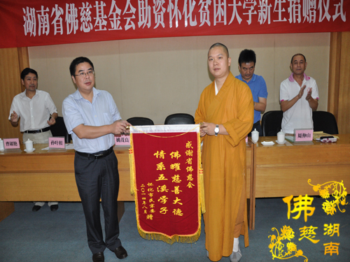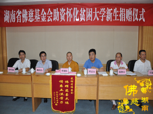 在怀化市办公会议室里举行了捐助仪式,湖南省佛慈基金会向怀化地区:麻阳县、辰溪县、沅陵县、会同县、溆浦县、新晃县、洪江县共28名贫困大学新生,给予每人4000元的助学善款,共捐善款11.2万元。捐助仪式上,通振法师代表圣辉大和尚鼓励所有的学子排除生活中的困难,努力学习,不辜负父母师长及社会上的善心人士对他们的期望,提高学习成绩,将来学有所成,报效祖国。