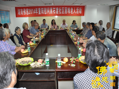 长沙市开福区四方坪街道黑石渡社区,驻辖已改制的单位有长沙市毛巾厂、湖南搪瓷厂、湖南矿用橡厂等。因市场经济体制改革,上述企业都已破产关门,社区内大部分居民为困难职工,老年人居多、残疾人多,居民生活条件较差。圣辉大和尚得知后,嘱咐省佛慈在重阳节之前,慰问看望这些贫困老人。