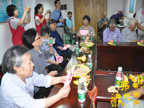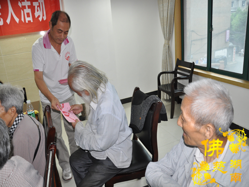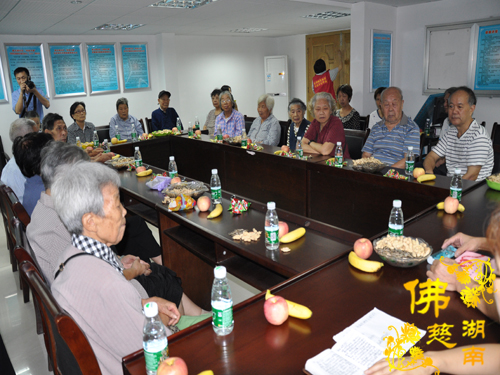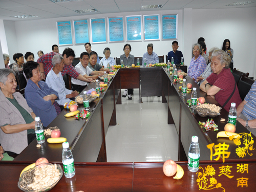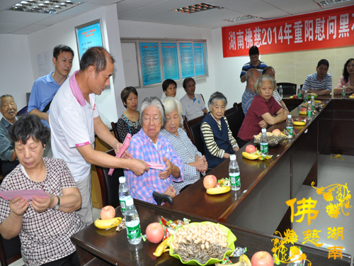 2014年9月29日上午,湖南省佛慈基金会周仲山秘书长受会长圣辉大和尚的嘱托,在重阳节到来之际,前往长沙市开福区四方坪街道黑石渡社区慰问30名贫困老人,给他们带去了过冬的帽子、围巾,并在茶话会上,给30位老人每人发200元慰问金。省佛慈真诚的祝愿这些老人们身体健康,吉祥如意,平安顺利的颐养天年。
