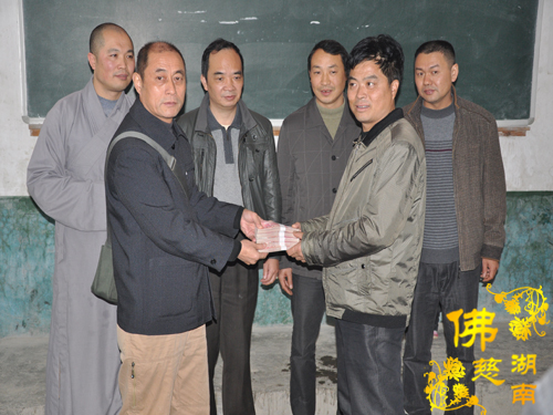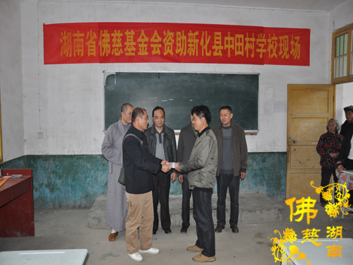 2014年11月25日下午,湖南省佛慈基金会周仲山秘书长,受中国佛教协会副会长、湖南省佛教协会会长、湖南省佛慈基金会会长圣辉大和尚的嘱托,前往新化县炉观镇中田小学,省佛慈给予该校5万元维修小学操场、购买饮水设备、修建围墙等资助。