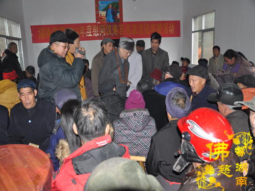 圣辉大和尚带领省佛慈到达常德市汉寿县月明潭乡敬老院,首先看望了孤老们居住的地方,对孤老们嘘寒问暖。并询问敬老院的生活情况。在捐赠仪式上,会长圣辉大和尚代表省佛慈基金会,给月明潭乡敬老院104位孤老和特困,每位发了200元的红包以及大礼包一份,还发放了绒衣和鞋帽一套。老人们都很高兴,一边吃着团年素饭一边不停的感谢党和政府及佛菩萨对他们的慈悲关怀。