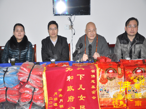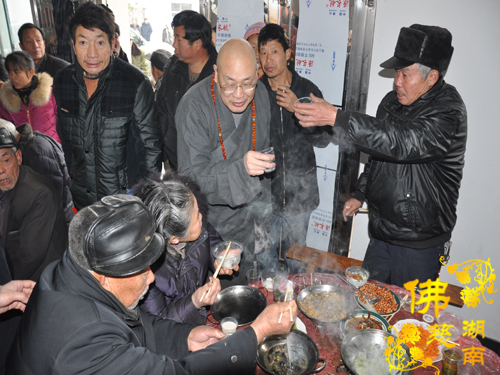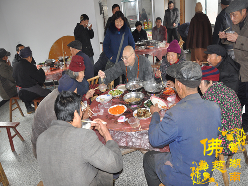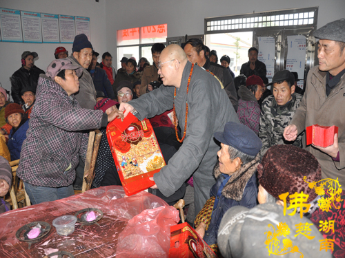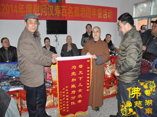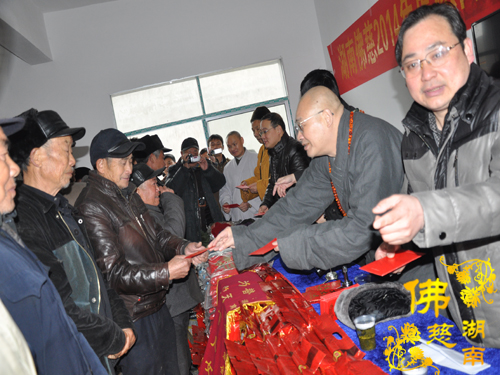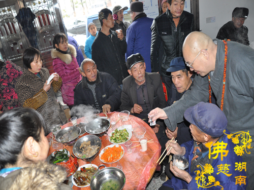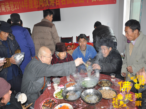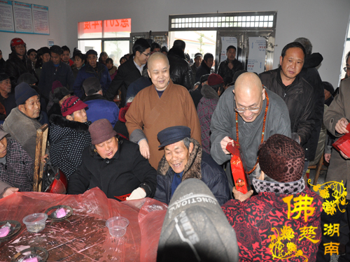 2015年2月2日上午,中国佛教协会副会长、湖南省佛教协会会长、湖南省佛慈基金会会长圣辉大和尚,带领湖南省佛慈基金会周仲山秘书长以及湖南省佛慈基金会工作人员,年终到常德市汉寿县月明潭乡敬老院慰问资助104名残疾孤老和特困,为他们送去新春的问候以及拜个早年。并且为汉寿县月明潭乡敬老院的孤老们办了十五桌团年素饭,使老人们提前过一个愉快温馨、吉祥和乐的新年。