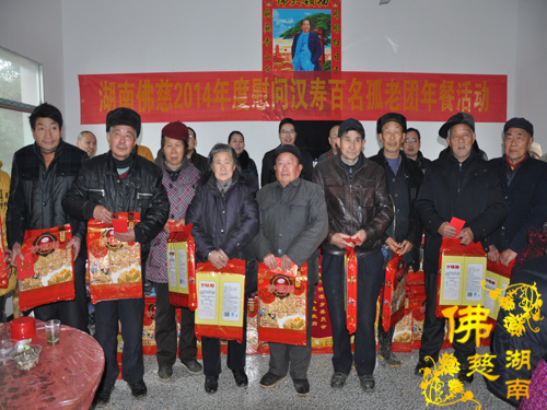 湖南省佛慈基金会在圣辉大和尚的领导下,坚持每年年终慰问资助残疾孤老们,这已形成惯例。此次湖南省佛慈基金会为常德市汉寿县月明潭乡敬老院资助善款及办团年素饭共用2.68万元。赠送的过冬物资及大礼包折合1.4万元,共捐4.08万元。