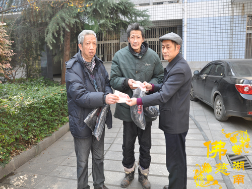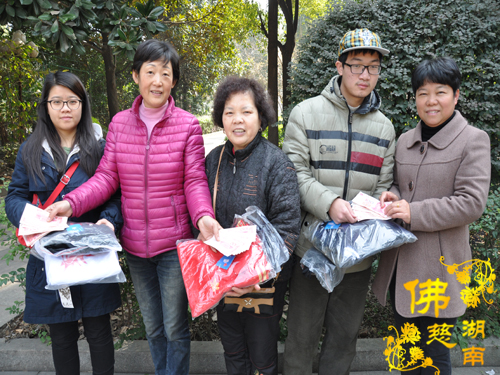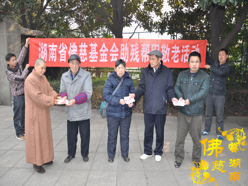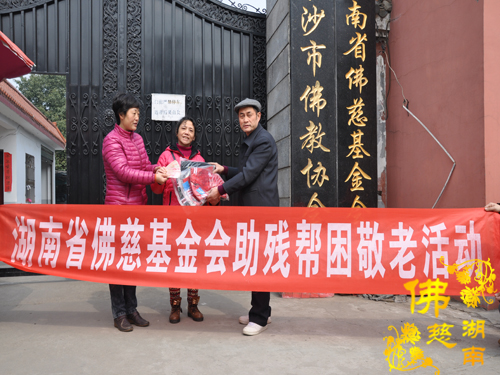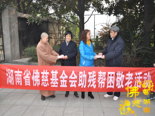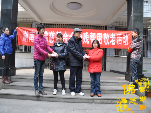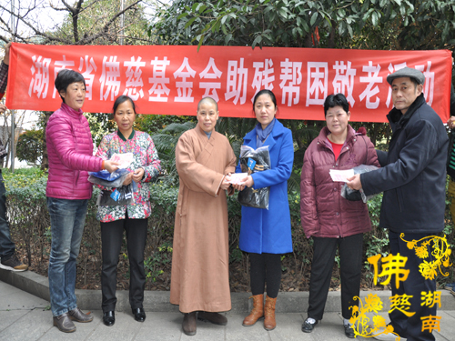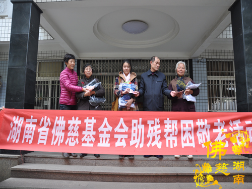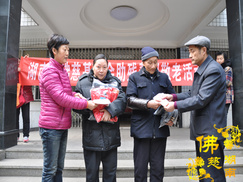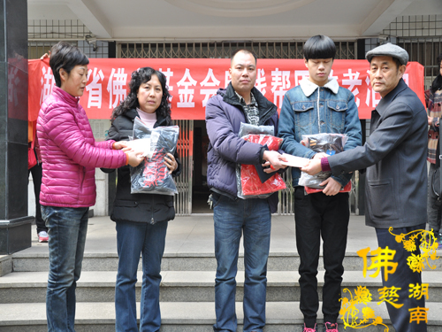 2015年2月12日,在春节即将来到之时,受中国佛教协会副会长、湖南省佛教协会会长、湖南省佛慈基金会会长圣辉大和尚的嘱托,湖南省佛慈基金会周仲山秘书长以及湖南省佛慈基金会工作人员,配合长沙市2015年社区“邻里守望,崇德向善迎新春、红红火火过大年”学雷锋慰问资助贫困家庭的活动,在几天时间内湖南省佛慈基金会陆续将44户贫困家庭,每户1000元的爱心善款和2件新过冬衣物,及时送到每户贫困人员的手中。让他们每户都感受到了来自党和政府以及省佛慈和社会爱心人士的温暖关怀,愿这些贫困家庭都能过个祥和温馨的新春佳节。