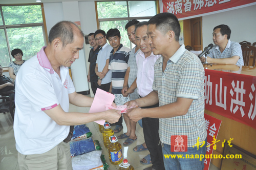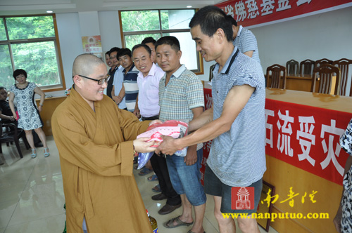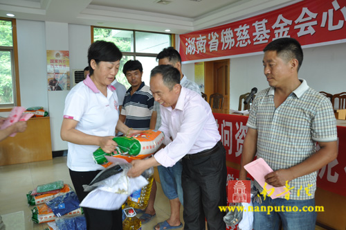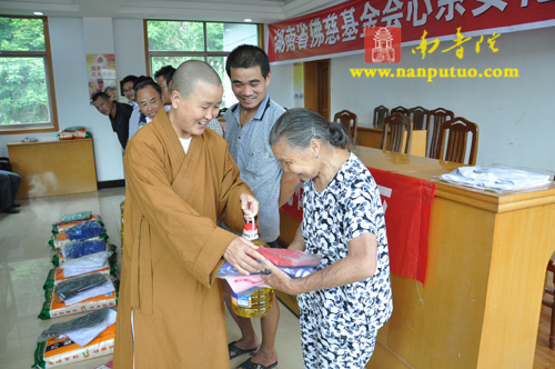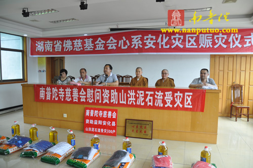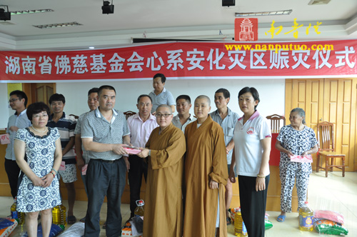 2015年6月25日下午,受全国人大代表、中国佛教协会副会长、 厦门南普陀寺慈善会会长、湖南省佛慈基金会会长圣辉大和尚的嘱托,厦门南普陀寺慈善会道晴法师、静仁法师与湖南省佛慈基金会周仲山秘书长、曹主任等一行,湖南慈善行第五站驱车来到湖南省益阳市安化县柘溪镇赈灾。厦门南普陀寺慈善会为该镇遭受洪灾的100户重灾户每户发放了300元慰问金及米、油等救灾物资,共计4.2万元善款;湖南省佛慈基金会捐赠600件新衣服,折合人民币3万元善款。希望灾区人民坚强勇敢的面对困难,早日渡过难关。