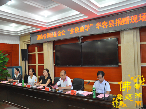 2015年8月29日下午,湖南省佛慈基金会周仲山秘书长受会长圣辉大和尚的嘱托,联合华容县宗教界,为华容县43位特困学生助学。湖南省佛慈基金会资助10名特困大学新生,每人4000元,另给予每人价值300元的新衣物,资助4.3万元。华容县宗教界资助15名高中学生,每人2000元,16名初中学生每人1000元,2名小学学生每人500元,资助4.7万元。共资助9万元。