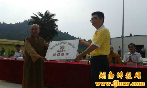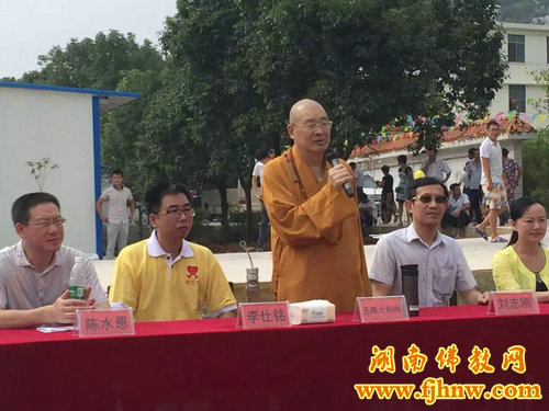 典礼一开始,庄严的国歌奏响,在小旗手的护卫下,鲜艳的五星红旗徐徐升起;随后又在悠扬的民乐声中,孩子们向正襟危坐的老师们举行了别具特色的拜师礼;学校发起人法广法师就创办慈善学校的缘起做了详细介绍;湖南省文明办志愿服务工作处处长李仕铭先生向学校授予了“湖南省志愿服务联合会同心善行社助学基地”的牌匾。最后,圣辉大和尚做了重要开示:他评价本次由佛教界人士联合社会力量创办慈善学校,是湖南佛教界公益慈善事业的一大善举,是湖南佛教界与社会主义社会相适应的重要举措,具有深远的意义。他建议学校在创办过程中一定要严格遵守国家教育规定,把对孩子进行德、智、体、美、劳的全面发展定为学校的教育方向,让这些曾经历过各种苦难的孩子们在这里开始正常、温暖的学习生活,并感受到社会各界人士对他们真诚的关爱。最后,大和尚还提出在办学过程中一定要量力而行,不贪多求大,努力做好包括食品、卫生等各方面校园安全工作。大和尚还强调,学校虽然是宗教界人士发起举办的,但在办学过程中一定不能带有任何宗教色彩,要让孩子们和其它孩子一样享受健康、公平教育的机会。要增加体育设施,加强孩子们的体能锻炼,聘请有资质的从师范学校毕业的优秀老师来任教。总之办学一定要遵循教书育人、从实际出发、一切为了孩子们的成长的原则,把学校办成有特色、有质量,符合教育规律的,成为精神文明建设的育人基地。同时表示省佛慈基金会将对这所学校长期关注,筹集财力、物力向这所学校倾斜。还呼吁各界爱心人士共同支持帮助这所学校,让学校发展壮大,为构建和谐社会,为实现中华民族伟大复兴的中国梦,做出贡献。
