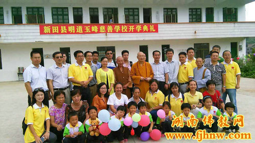 新田县明道玉峰慈善学校是一所由新田县玉峰寺住持释法广法师联合爱心企业家黄保黔先生发起举办,面向孤儿和特困户家庭孩子的全免费、九年一贯寄宿制学校。经新田县教育局按有关法律法规批准,并同意免费借用该县冷水井乡一贯制学校辖区内一处,大约5千平米房屋及教学场地作为该学校的教学用房、作学生宿舍及教职员工宿舍来使用。第一期将开办一至四年级四个班,预计八十个学位,已有18名教职员工、六十多名学生入驻。