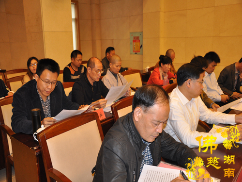 全国人大代表、中国佛教协会副会长、湖南省佛教协会会长、湖南省佛慈基金会会长圣辉大和尚在会上作了本会慈善工作汇报发言,湖南省佛教界每年筹集几百万元善款,实施救灾赈灾、扶贫济困、助学助残、敬老养老、修桥铺路等“慈善行”活动,其中长期资助的有各地救灾济困,保护候鸟迁徙,长沙市牛角塘社区无障碍建设,汨罗崇善安养院,永州新田苦志育才孤儿小学,几个县级麻风村等项目。此次我会向湘西吉首阳孟村捐善款15万元,用于修路、路灯工程费。