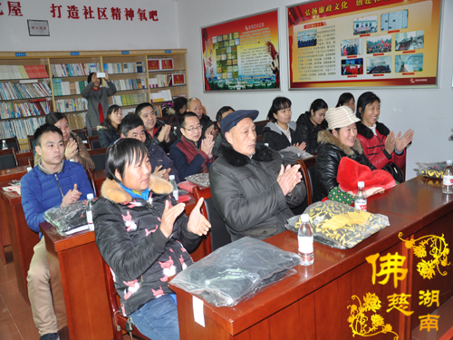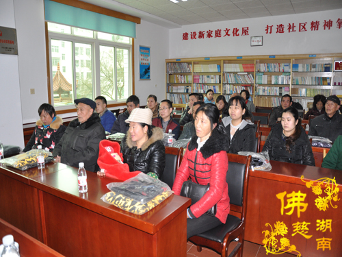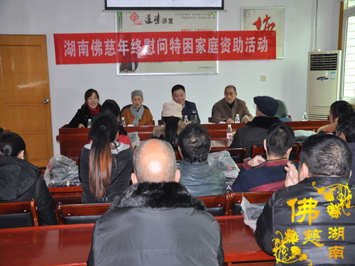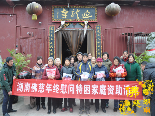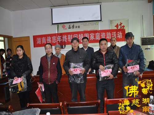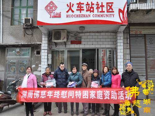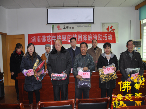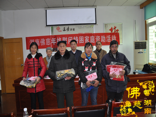 2015年12月28日上午,湖南省佛慈基金会周仲山秘书长、办公室主任曹银艳,受会长圣辉大和尚委托,前往湘潭韶山市社区资助30户特困家庭,每户1000元。接着又到湘潭市雨湖区姜畲镇清联村胜坝组资助5户特困家庭,每户1000元。还到湘潭市雨湖区云塘街道火车站社区资助3户特困家庭,每户1000元。资助汨罗特困家庭3户,共资助41户特困家庭,并给予41户每户2件新衣物,共计3000元,共捐助善款4.4万元。