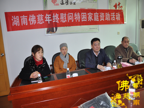 参加捐赠的领导及佛慈组长有:湘潭市佛协会长、海会寺住持渊博法师、湘潭市政府办副主任张驰、单霞科长、韶山市政府办副主任刘友玲、湘潭市雨湖区姜畲镇迎龙寺住持妙提法师、湘潭市居士组长罗秋平、谷秋云等参加此次捐助。