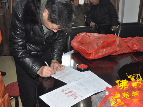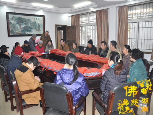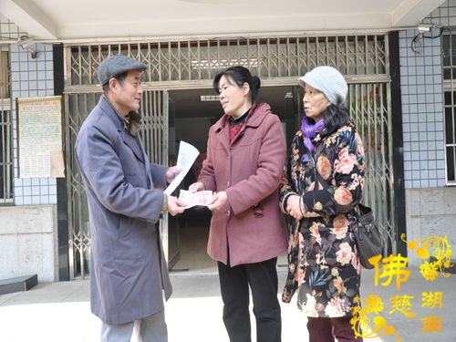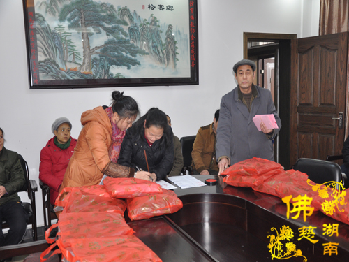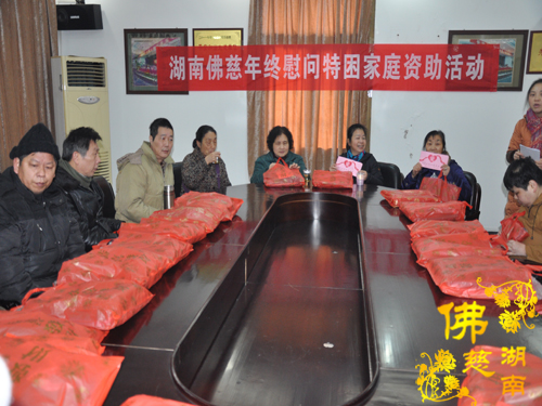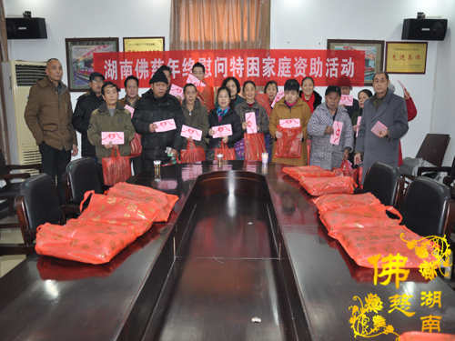 2016年1月18日上午,湖南省佛慈基金会周仲山秘书长受会长圣辉大和尚和副会长能净法师的嘱托,在春节即将来临之际,慰问资助长沙市开福区新河街道幸福桥社区的48位残疾特困,给予每位400元善款以及新衣两件折合100元,共捐善款2.4万元。省佛慈同时给予因不小心从三楼摔下,至今昏迷不醒还在省人民医院抢救的新化县芦茅江社区,年龄才九岁的李维家2000元的医疗补助。