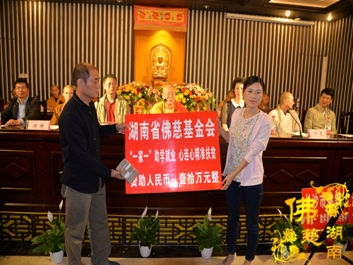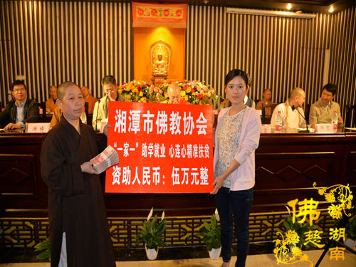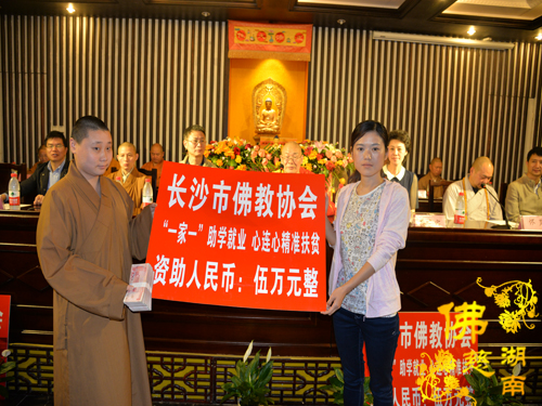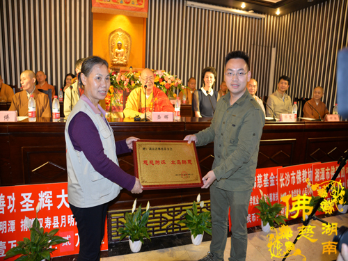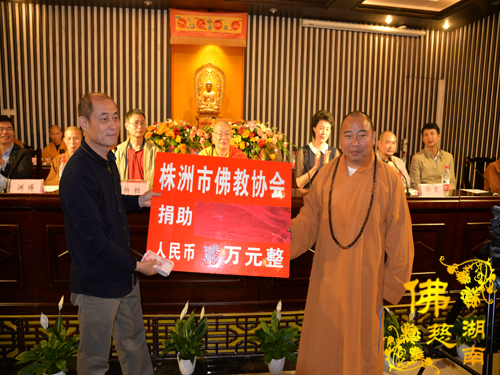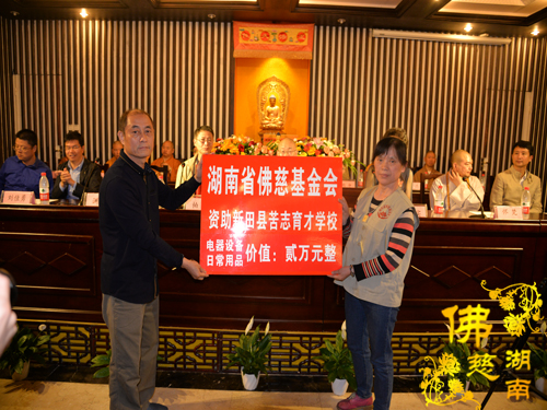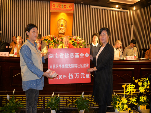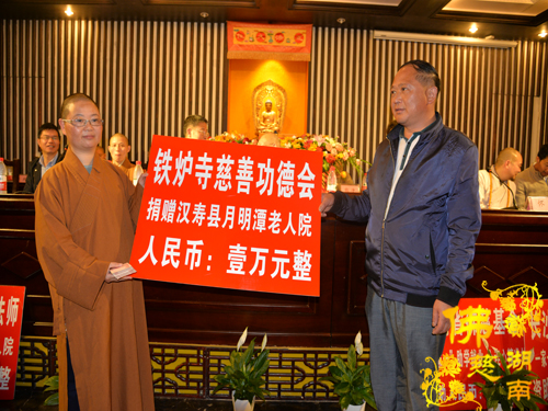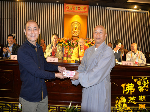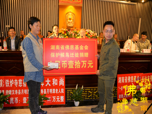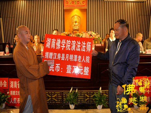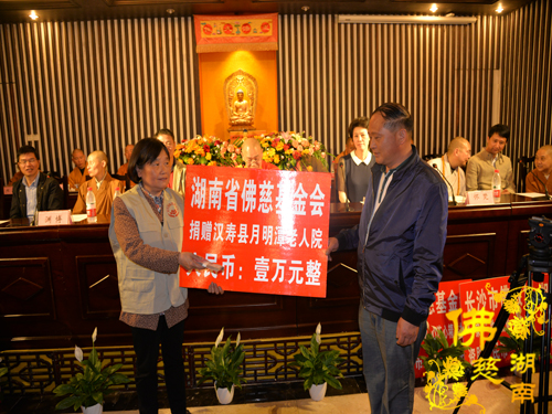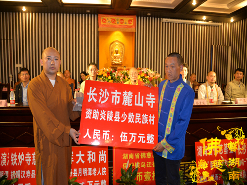 同时,在闭幕式上,承办宗教场所——长沙麓山寺首先捐赠5万元给炎陵县畲族少数民族村。继麓山寺率先捐善款后,湖南省佛慈基金会为保护候鸟迁徒活动捐赠10万元;圣辉大和尚捐助汉寿县月明潭乡老人院2万元;长沙市铁炉寺慈爱功德会向汉寿县月明潭乡老人院捐赠1万元;长沙麓山寺演法法师向汉寿县月明潭乡老人院捐赠1万元;湖南省佛慈基金会向汉寿县月明潭乡老人院捐赠1万元;湖南省佛慈基金会资助“一家一”助学就业心连心精准扶贫项目10万元;长沙市佛教协会资助“一家一”助学就业心连心精准扶贫项目5万元;湘潭市佛教协会资助“一家一”助学就业心连心精准扶贫项目5万元;湖南省佛慈基金会捐赠5万元用于帮助长沙市牛角塘建设无障碍社区项目;湖南省佛慈基金会资助永州新田苦志育才学校物资折合2万元;株洲佛协向苦志育才基金捐2万元;湘阴佛协向苦志育才基金捐1万元;长沙市两位居士向苦志育才基金捐1万元;现场共收到自发捐助慈善款51万元,所有到会人员都随喜赞叹慈善捐赠的善心善行。