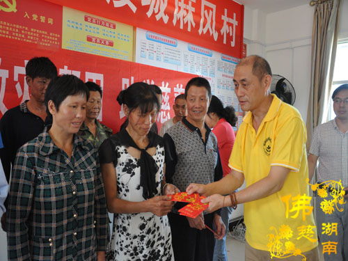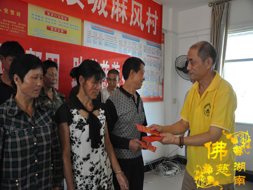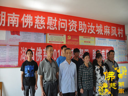 汝城县麻风村位于汝城县大坪镇乌泥洞,地处与外界自然隔离的深山之中,今年受强厄尔尼诺影响,雨水太多,几处塌方,水沟、路面损坏严重,汽车也无上山,给麻风村民生产生活造成困难,全国人大代表、中国佛教协会副会长、湖南省佛教协会会长、湖南省佛慈基金会会长圣辉大和尚得知后,委托湖南省佛慈基金会秘书长周仲山、惟贤副秘书长等一行2016年7月8日上午第五站来到郴州汝城县慰问资助麻风村5万元,鞋子50双,使麻风村早日恢复山洪造成的损失。