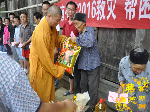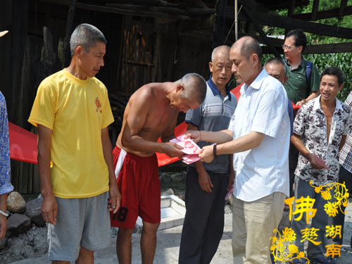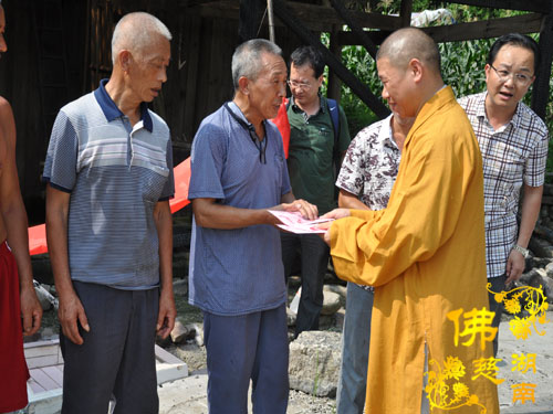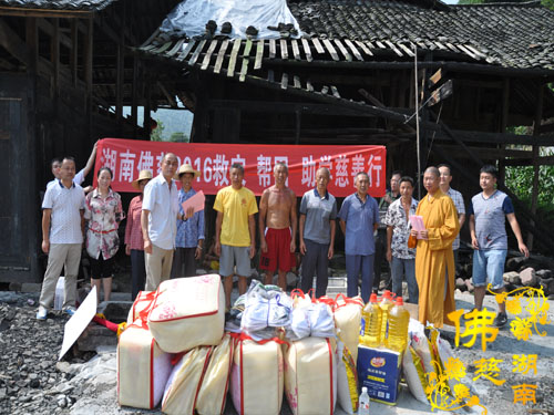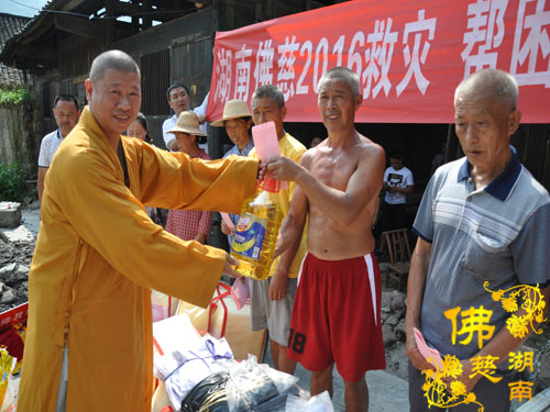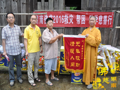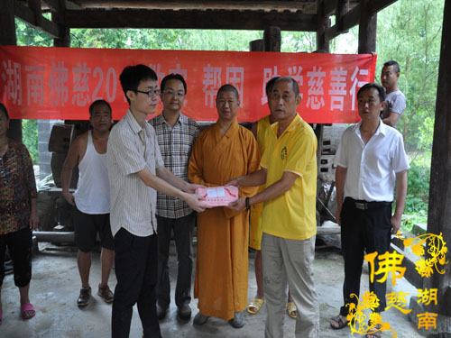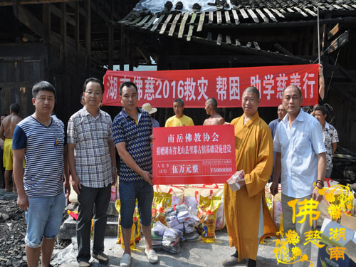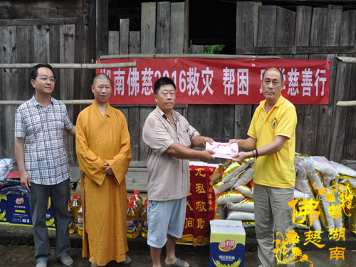 2016年7月11日下午,受圣辉大和尚的委托湖南省佛教协会副会长怀泉法师、湖南省佛慈基金会周仲山秘书长等一行第八站来到湘西龙山县苗儿滩镇捞车河村慰问资助七户因火灾受困户,每户慰问金2000元、价值200多元的棉被2床、大米一包食用油一桶及全新衣服3件,计2万元。