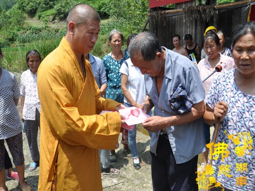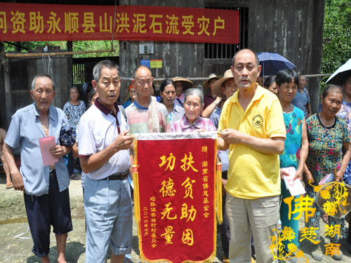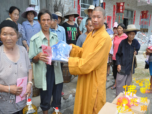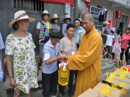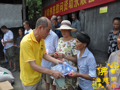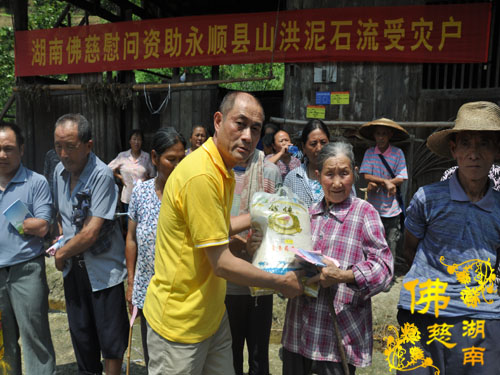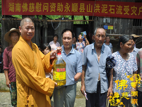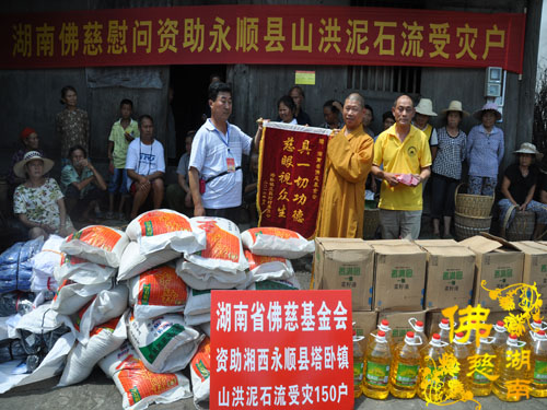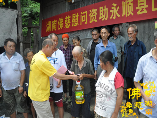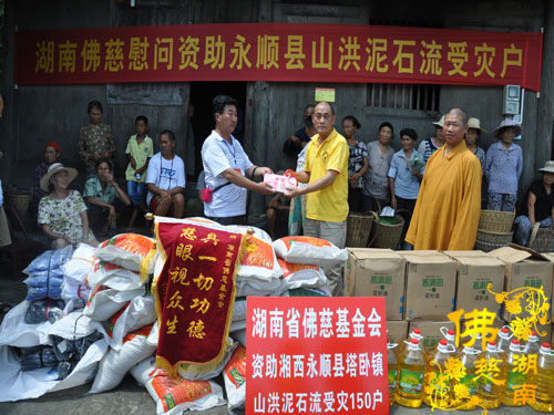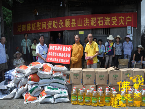 今年5月以来湘西永顺县塔卧镇多次风雹、洪涝灾害,导致部分民众受困,财产受损。2016年7月12日下午,湖南省佛教协会副会长怀泉法师、湖南省佛慈基金会周仲山秘书长等一行受圣辉大和尚的委托第九站来到湘西永顺县塔卧镇茶林村和文昌村共慰问资助150户受灾户,每户慰问金400元、大米一包、食用油一桶及全新衣服3件.共计10.8万整。