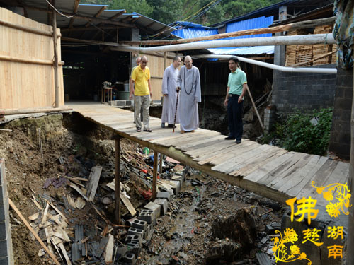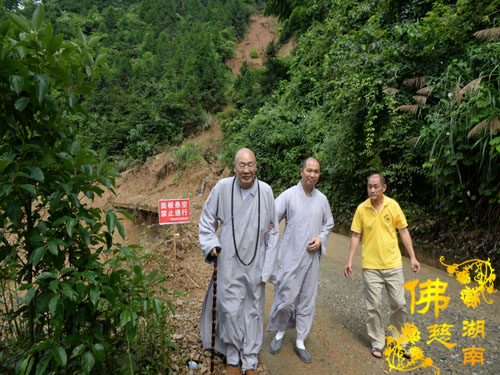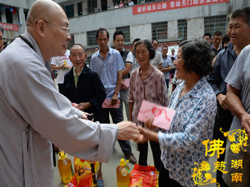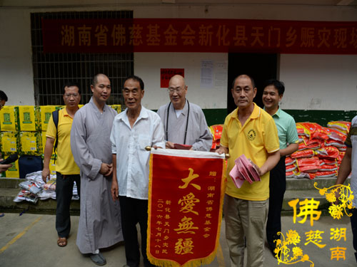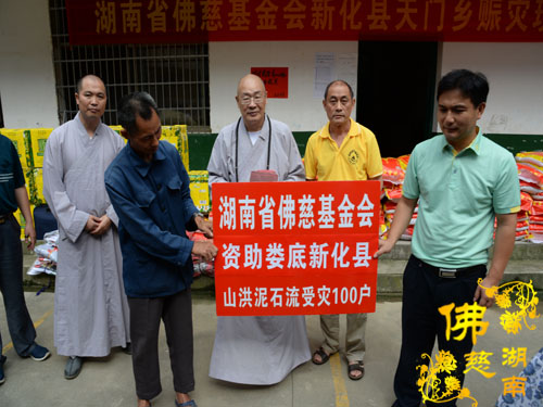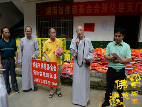 2016年7月19日上午,全国人大代表,中国佛教协会副会长,湖南省佛教协会会长,湖南省佛慈基金会会长圣辉大和尙带领湖南省佛慈基金会秘书长周仲山等一行,经过长途跋涉,翻山越岒来到了新化县天门乡因遭受特大暴雨造成山洪暴发,山体滑坡,泥石流等灾情的灾民进行了慰问。这次为共100户受灾民每户发放现金400元,发放物资大米,食用油每户价值120元,并且为每户发放了全新品牌夏装,每户价值100元。这次共捐善款物资6.2万元。圣辉大和尚对受灾乡亲进行了亲切慰问亲自把赈灾物资发放的乡亲们的手上,鼓励灾民们战胜困难,重建美好家园。