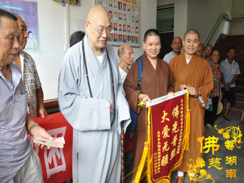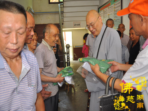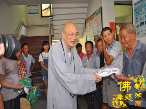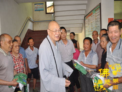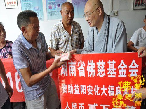 2016年7月25日上午,中国佛教协会副会长、湖南省佛教协会会长、湖南省佛慈基金会会长圣辉大和尙带领佛慈基金会周仲山秘书长、开福寺惟德法师、知意法师等一行,第十五站来到益阳市安化大福麻风村看望慰问麻风村的村民,并送上慰问金2万元,衣服70件,鞋子30双。
