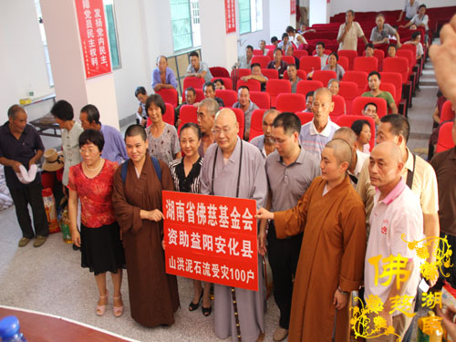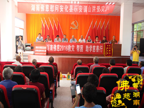 2016年7月25日下午,中国佛教协会副会长、湖南省佛教协会会长、湖南省佛慈基金会会长圣辉大和尙带领佛慈基金会周仲山秘书长、开福寺惟德法师、知意法师等一行,第十六站到安化县乐安镇赈灾,慰问资助100户受灾村民,每户发放现金400元、大米一包、食用油一桶装及全新衣服一件,这次共捐善款物资6.2万元。帮助洪涝受灾村民渡过暂时困难,自力更生,努力建设好自己的家园。