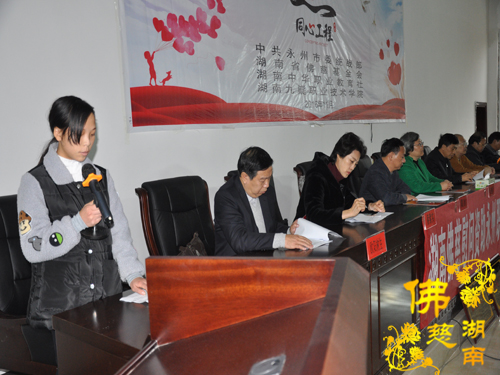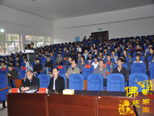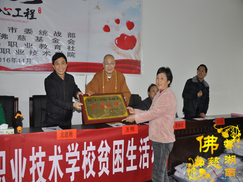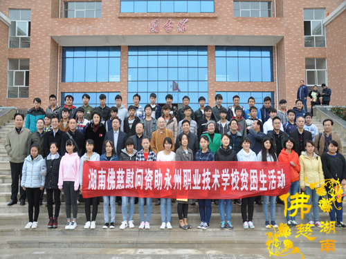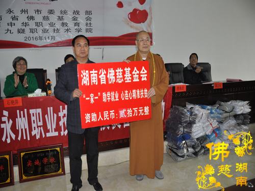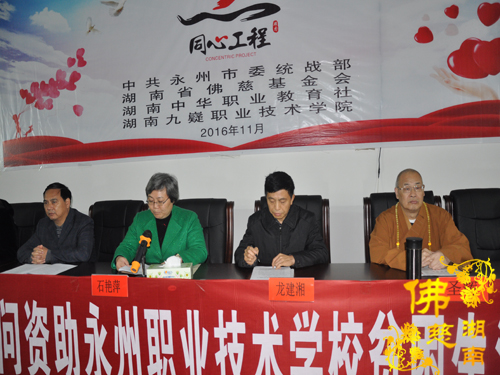2016年11月22日,省委统战部副部长龙建湘、省委统战部民宗处调研员蔡素实、湖南省佛教协会会长、湖南省佛慈基金会会长圣辉大和尚、湖南省佛慈基金会秘书长周仲山、湖南省佛慈基金会办公室主任曹银艳等一行人,到永州市湖南九嶷职业技术学院,举行湖南“一家一”助学就业同心温暖工程“省佛慈同心班”捐助暨开班仪式。