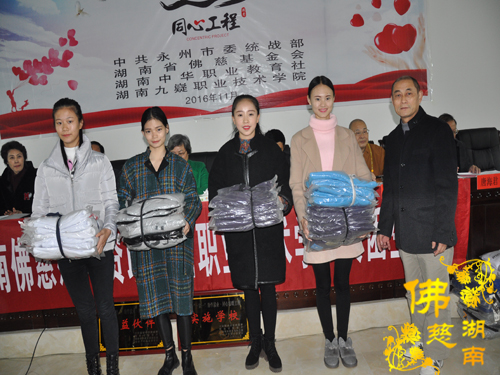 湖南省佛慈基金会本着“不为自己求安乐,但愿众生得离苦”的精神,积极落实国家脱贫攻坚战略,大力配合省委、省政府开展扶贫助学项目。湖南省佛慈基金会向湖南“一家一”助学就业同心温暖工程,永州市湖南九嶷职业技术学院“省佛慈同心班”捐助助学善款20万元,同时捐新外套100件,折合1.2万元。
