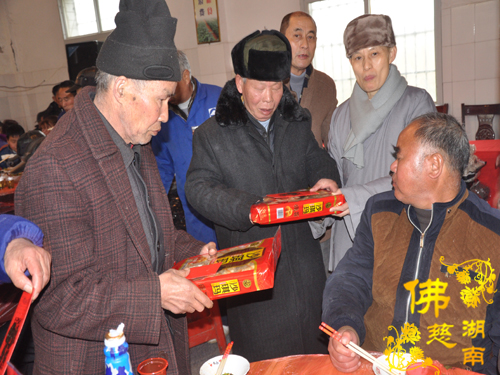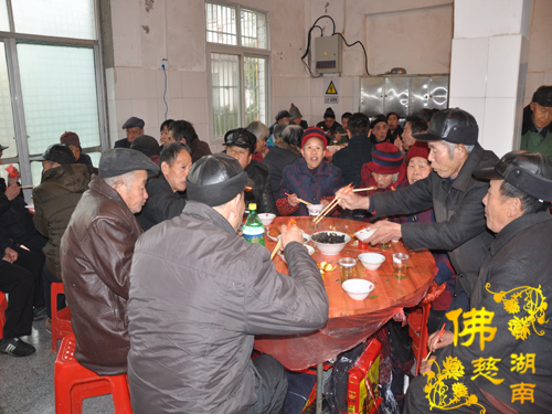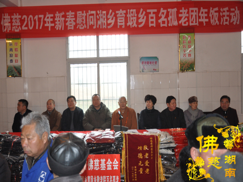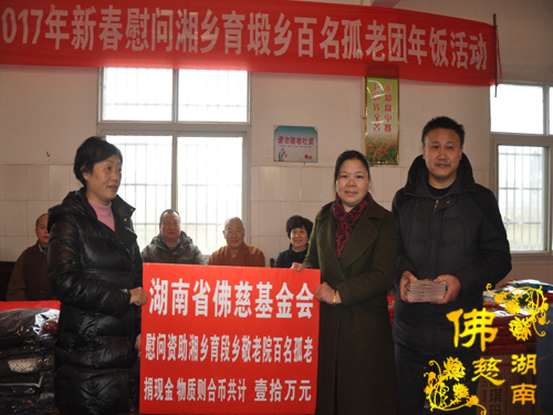 捐赠仪式上,湖南省佛慈基金会为孤寡老人们在敬老院的餐厅内举办了2017年新春慰问资助百名孤老团年饭活动,办了15桌素菜请100名孤老吃团年素饭。敬老院的老人们相聚一堂兴高采烈,边吃边谈。湖南省佛慈基金会资助湘乡育塅乡敬老院100名残疾孤老,每人一个红包200元。另捐5万元现金用于育塅乡敬老院孤老们日常生活开销。还捐了新棉衣、毛衣各100件,另给湘乡育塅乡敬老院送去食油500斤,大米120斤,香菇、木耳素菜等。共捐助善款及物资:10万元。