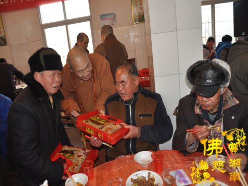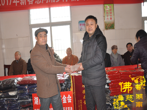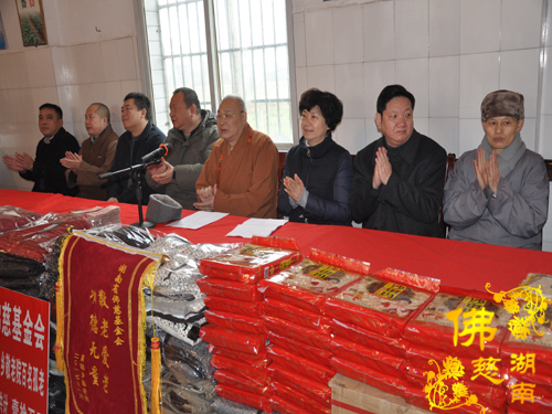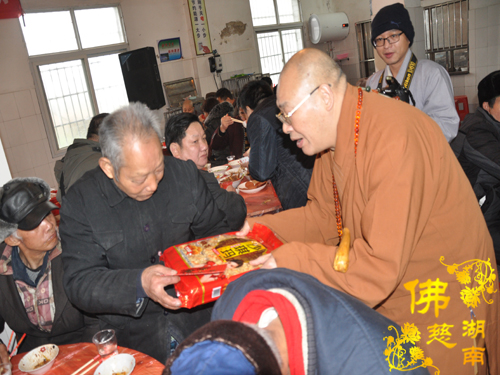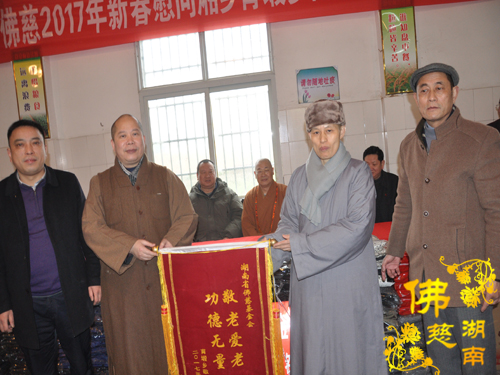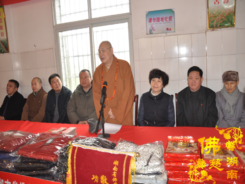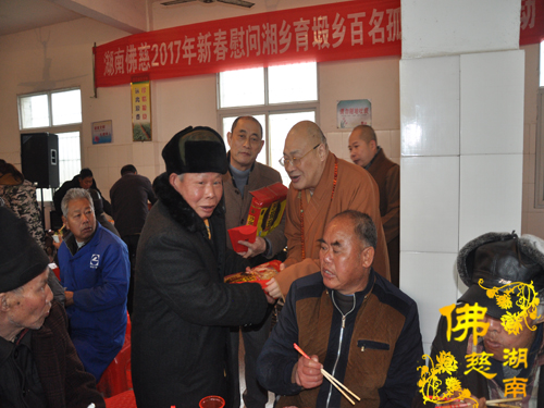 2017年1月11日上午,中国佛协副会长、湖南佛协会长、湖南省佛慈基金会会长圣辉大和尚带领湘潭市佛协渊博法师、湘乡市云门寺法通法师、湘潭市迎龙寺妙提法师、省佛慈基金会周仲山秘书长等前往湘乡市育塅乡敬老院慰问及资助100名残疾孤老,给他们送去了过冬的食物及御寒新棉衣、毛衣。