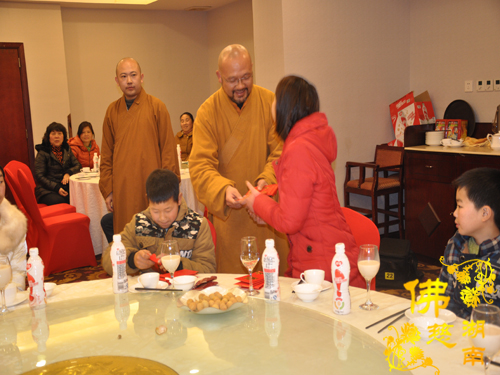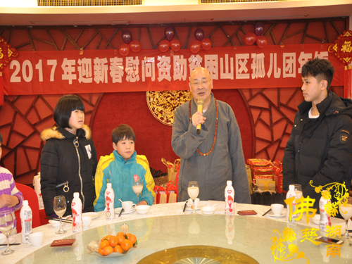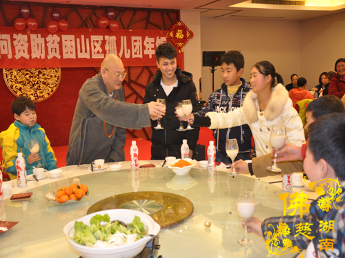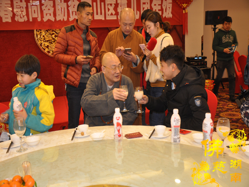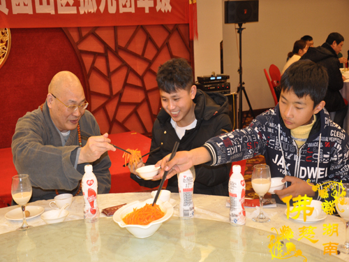 圣辉大和尚在用餐时,不断地给孤儿们夹菜、添饭,嘱咐他们吃好吃饱,同时勉励12名孤儿,愉快轻松地过好每一天,还要克服生活中的困难,勇于在学习中进取,发挥各自的长处回报社会,争当社会有用之才。宴会上弥漫着感恩、温馨的气氛。我们都是大家庭中的一份子,不分彼此,相互关爱、相互温暖,其乐融融。这样的大爱充分体现了社会的“真善美”无处不在。