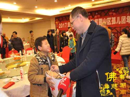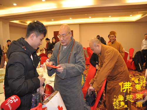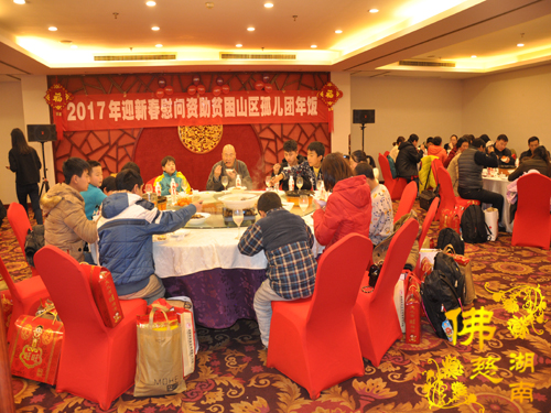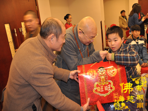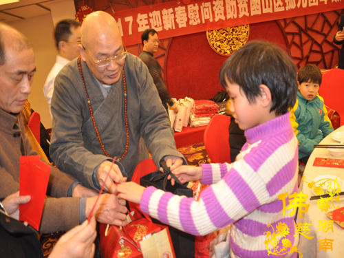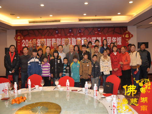 由中国佛教协会副会长、湖南省佛教协会会长、湖南省佛慈基金会会长圣辉大和尚本人亲自发起,再次在长沙市麓山宾馆为湖南贫困山区12名孤儿举行捐资助学的活动。圣辉大和尚个人出资7.5万元,给予11名孤儿每人5000元资助,给予读民政学院的1位孤儿7000元资助。另给予每人2件新羽绒服和2件新毛衣,同时还给同来的监护人,每人发500元。并在长沙市麓山宾馆举办迎新春慰问孤儿团年午餐,宴请12名孤儿和所有到会人员吃团年素饭。