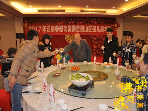 2017年1月20日,在长沙市麓山宾馆举行迎新年慰问资助湖南贫困山区12名孤儿团年活动。圣辉大和尚从边远山区再次迎来了龙山县覃明彪、曾强鑫、周志国、陈思思、陈星宇,衡东县罗开,新邵县毕珊嫣,隆回县肖文杰、李曼菲,张家界田志豪、慈利吴钊锑、吴贤满共12名湖南贫困山区的孤儿。他们最小的才7岁,最大的18岁。今年这些孤儿面貌大不一样,长大了一岁,都显得格外懂事,格外阳光,因为有爱温暖了他们。