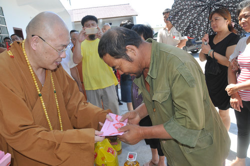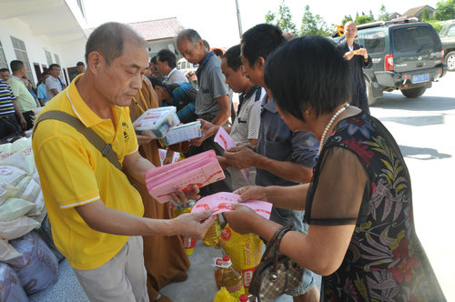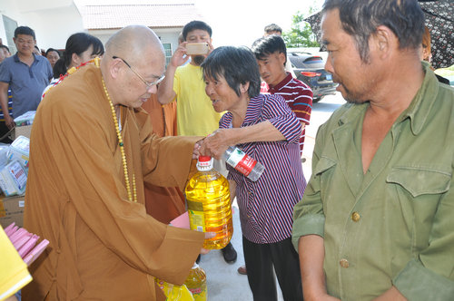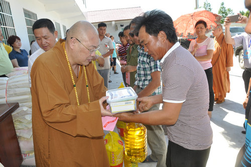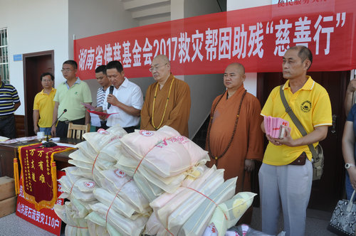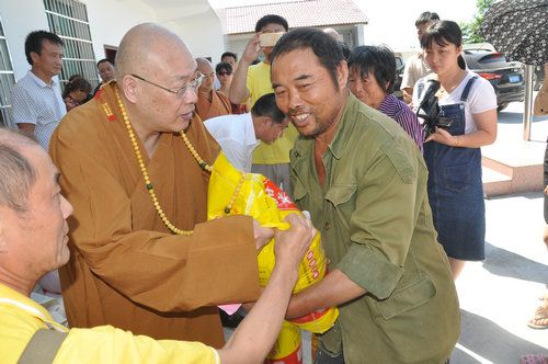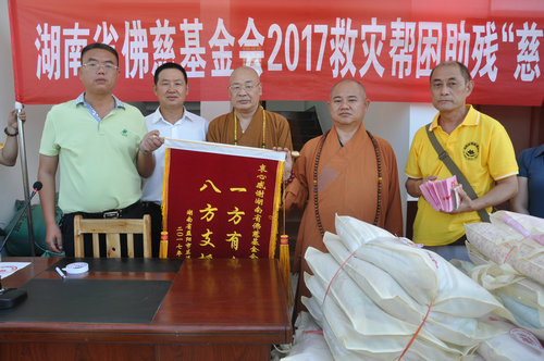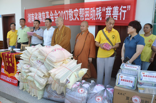 2017年7月19日上午,中国佛教协会副会长、湖南省佛教协会会长、湖南省佛慈基金会会长圣辉大和尚,不顾连日来的舟车劳顿,冒着酷暑,在益阳市政府副秘书长、民宗局局长王国保以及湖南省佛协副会长、益阳市佛协会长明良大和尚、湖南省佛慈基金会秘书长周仲山等同志陪同下,带领湖南省佛慈基金会志愿者等一行人,湖南佛教慈善行第六站来到益阳市赫山区兰溪镇赈灾。
